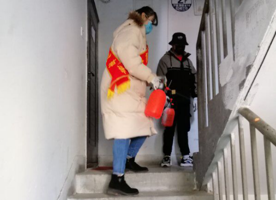 2.17日,今天是她志愿服务的第三天,是一名“消毒员”。工作内容是对小区家属楼进行消毒。消毒工作看似简单,但是要求很高,要做到全方位无死角,一旦遗漏就会大大的增加病毒传播的风险。村妇联孙主任带着我,来到家属楼,对楼梯、大门、垃圾桶、停车位进行消毒,一边喷洒消毒药水,一边小声念到“病毒死光光”。