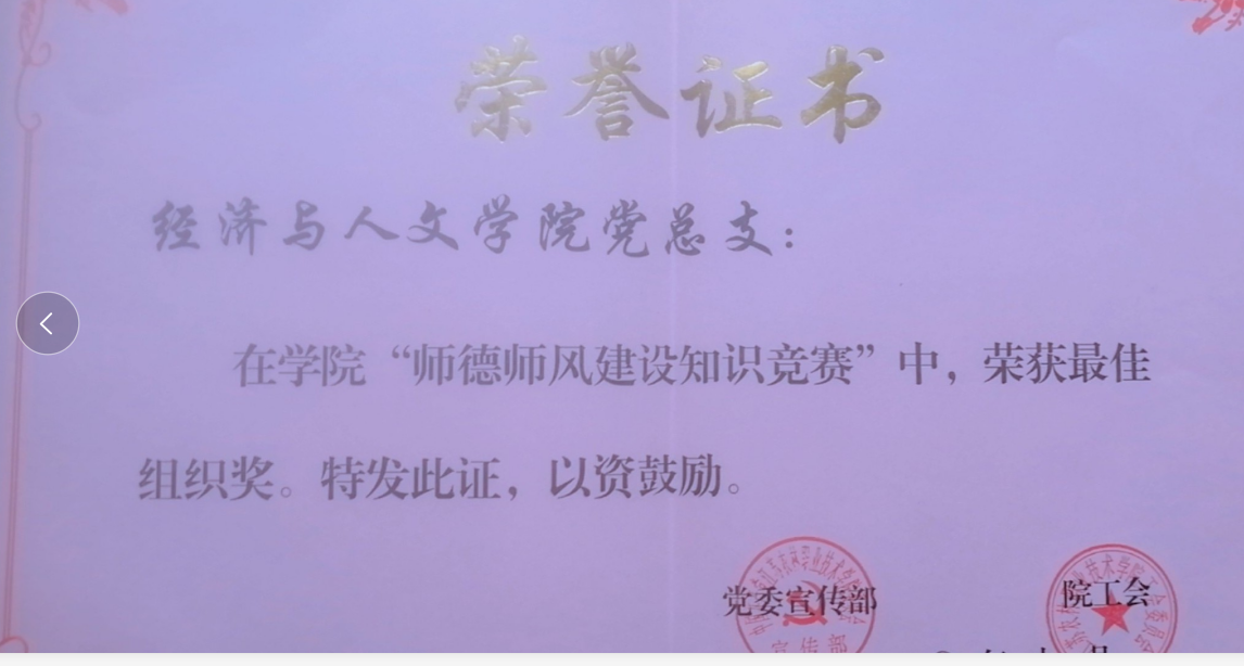 在学校暑期举行的“师德师风建设知识竞赛”活动中,我院党总支积极组织全体教师参与学习和答题,参与率高。胡彩红、尹文华、王娟三位教师分别获得一等奖、二等奖和三等奖的成绩,经济与人文学院党总支被评为“最佳组织奖”。(供稿:曾晨 审稿:夏祖国)